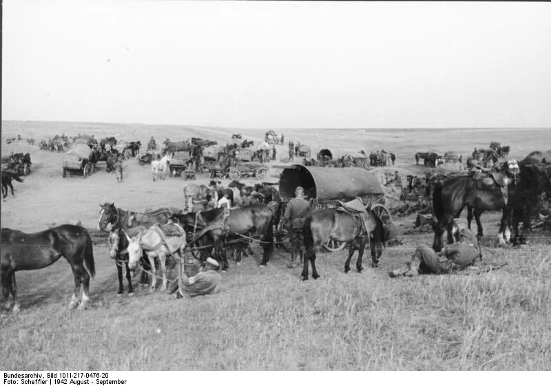 In common with every other European army (other than the British Army,) the Red Army had to rely on extensive use of horses in addition to their motor vehicles. These armies reflected their heritage from the Great War and used railways for strategic/operational transport and supply, their motor fleet to link the railways with the field armies and then a mix of motor and horse-drawn vehicles to supply their unit transport and army supply units. Some armies such as the German concentrated a substantial proportion of their motor stock in specialised armoured divisions leaving their infantry divisions equipped with horses. [See DiNardo] The Red Army followed a similar pattern with horses fulfilling many of the roles of unit transport and pulling guns in the Rifle Divisions that made up the majority of the Red Army so that the motor vehicles could be concentrated in the Tank Armies and the Artillery Arm, particularly to equip the anti-tank gun units. The balance between the various type of transport and their deployment are given in Великая Отечественная война 1941 - 1945 гг.: Действующая армия [Great Patriotic War 1941-1945: The Operational Army]