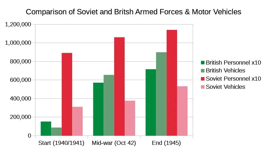 This viewpoint is limited by the fact that it gives no indication of whether this is a sufficient number of vehicles to make a difference to a field army of 6 million or an overall size of 11 million personnel. For comparison, the British Armed Forces can be used as figures are supplied in the Official History "Fighting Support and Transport Vehicles" which for June 1940 gives the overall military fleet as 149,414 with 89,118 vehicles (excluding motorcycles) shipped over to the BEF in France which consisted of 400,000 men in 10 Divisions with a ratio of 4.5 men per vehicle. Around 80,000 of these vehicles were lost at Dunkirk but by using British, Canadian and American production facilities by October 1942, the British had a vehicle holding of 3,092,322 vehicles and motorcycles which gave them a military fleet of 827,893 (or 656,044 motor vehicles and 171,849 motorcycles). This fleet continued to grow so that by Jan 1945, the military fleet measured 1,275,697 motor vehicles excluding motorcycles with a total of 684,877 trucks and lorries. This fleet serviced an Armed Forces of 4.8 million personnel giving a ratio of 3.76 men per vehicle. Clearly the 621,284 vehicles of the 11 million strong Red Army was a long way from this fully motorised force with a ratio of 18 men per vehicle. Also the military fleet alone of Great Britain exceeded the entire stock of motor vehicles of the entire Soviet state.