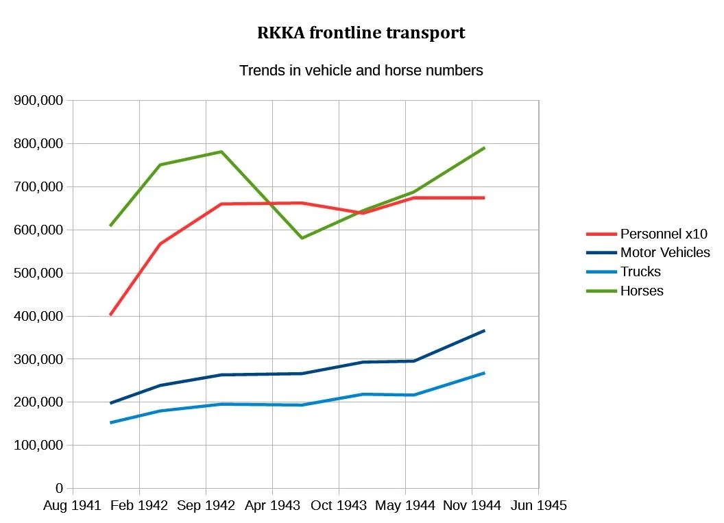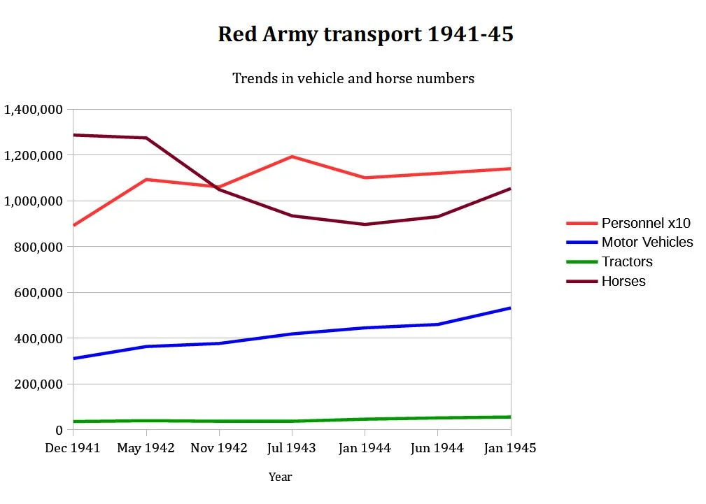 David Glantz has written extensively about the Motor-Mechanisation program of the Red Army in the Interwar Years to show the great efforts made by the RKKA to modernise. This was based on a mix of motor vehicles and tractors equipping the relatively small peacetime army. Once the threat of war loomed the Red Army expanded, finding like most European nations, the scale of the task was huge and not matched by the motor vehicle stocks or production capability of the civilian sector and so the army had to resort to mobilising vehicles from the civil economy. The common narrative as expounded in books like "The Roads to War" is that the numbers of vehicles rose steadily in the Red Army throughout the war and this led to increases in the tempo of its operations in 1944 and 1945.